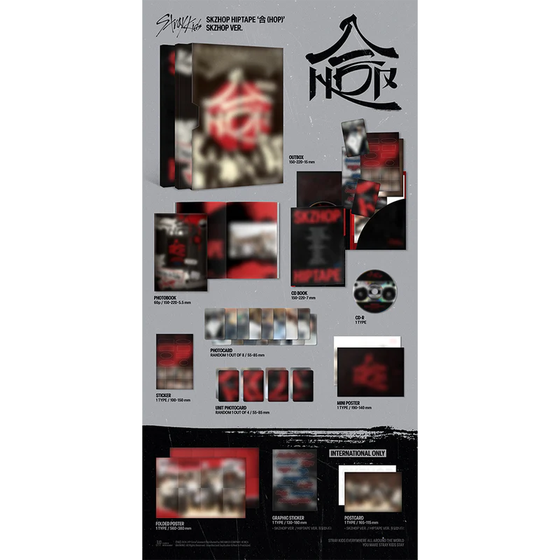Contents of the album include: CD, Outbox, Photobook, CD Book, Photocard (random 1 of 8), Unit Photocard (random 1 of 4), Sticker, Mini Poster, Folded Poster and Graphic Sticker. Stray Kids Shop Exclusive: Signed Postcard (1 of 8). Dimensions: 220 x 150 x 15 mm.